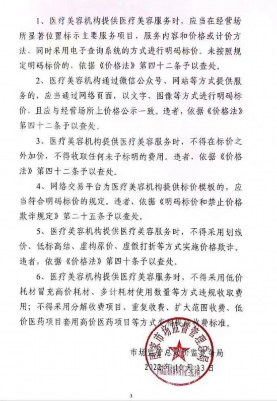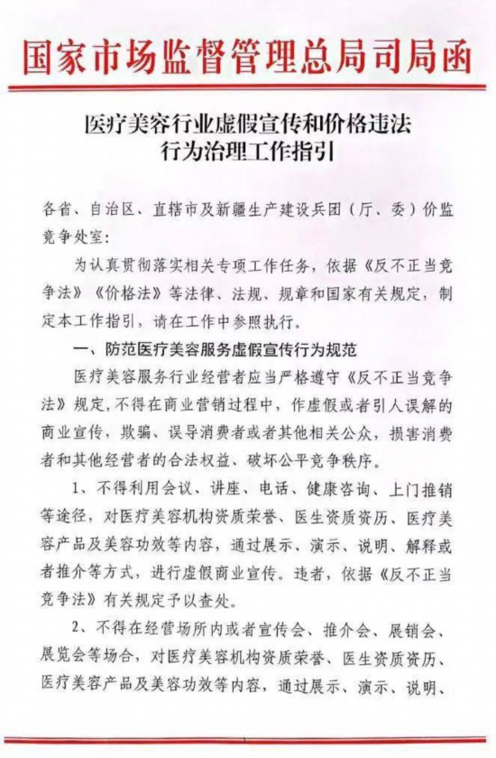 10月13日,国家市场监管总局价格监督检查和反不正当竞争局发布《医疗美容行业虚假宣传和价格违法行为治理工作指引》,强调要防范8项虚假宣传行为、6项价格违法行为,涉及在会议讲座、展销会、自媒体等场合进行虚假宣传,通过低标高结、虚构原价、虚假打折等方式进行价格欺诈,这些行为均将受到严厉查处。具体内容如下: