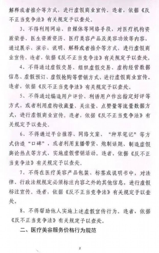 1、不得利用会议、讲座、电话、健康咨询、上门推销等途径,对医疗美容机构资质荣誉、医生资质资历、医疗美容产品及美容功效等内容,通过展示、演示、说明、解释或者推介等方式,进行虚假商业宣传。违者,依据《反不正当竞争法》有关规定予以查处。