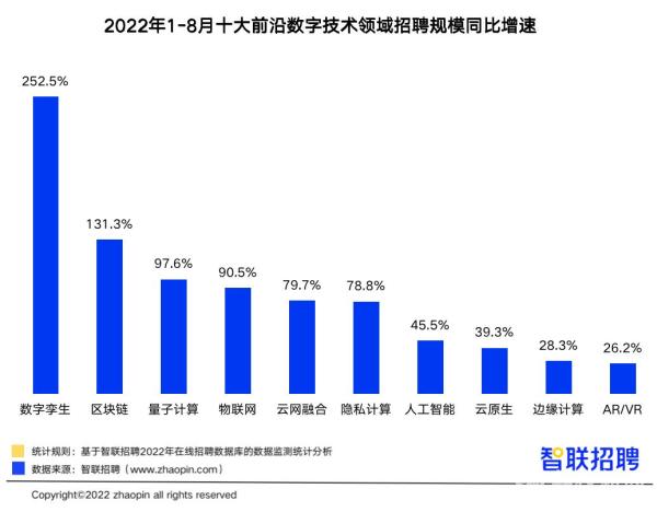 伴随着数字技术的应用落地,相应人才招聘需求也随之涌现。数据显示,今年1-8月,十大前沿数字技术中,数字孪生领域技术岗位招聘规模同比增速最高,达252.5%。其次是区块链,以131.3%的招聘需求增速紧随其后。