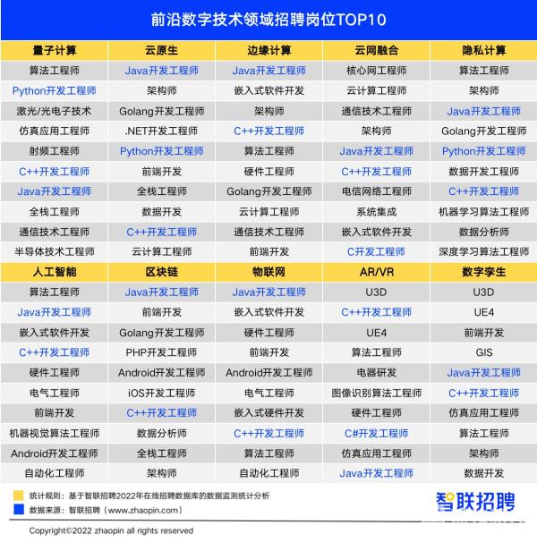 报告指出,十大前沿数字技术领域对光电子技术工程师、架构师、软件开发工程师、软硬件开发工程师等核心技术人才有较高需求。