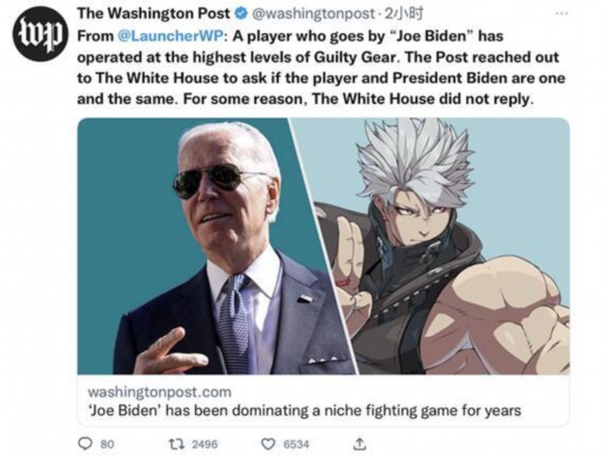 这篇有关“乔·拜登”的报道发布在《华盛顿邮报》有关电子游戏的“LAUNCHER”专栏。在开头部分,报道煞有其事地说,“每一个竞技场中都有一个恶灵,一个名字,当这个名字被唤起时,就会让对手感到畏惧。在棒球界,这个名字是大谷翔平,他的投球和击球能力就像他出生在球场上一样。在拳击界,这个名字是德昂塔·维尔德,他超自然的出拳能力可以击倒巨兽。在格斗游戏系列《罪恶装备》中,这个名字则是乔·拜登”。