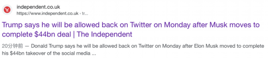 很快,ANI再次发推称,“撤回”早些时候发布的报道推文,“特朗普尚未就埃隆·马斯克收购推特发表任何声明。现在流传的这个声明是虚假的”。ANI表示,“对错误感到抱歉”。《独立报》也在晚些时候修改了报道,原标题为“马斯克440亿美元收购推特后,特朗普表示,他将于下周一重返推特”的报道目前已不可见。