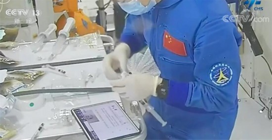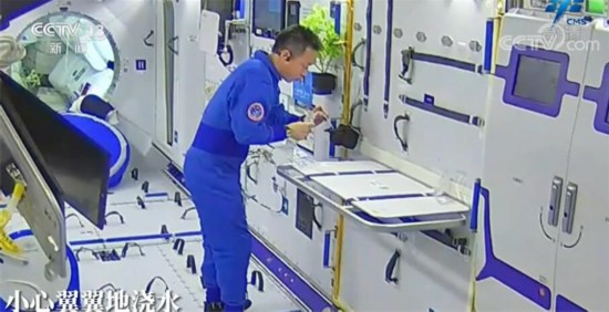 这是在问天实验舱,蔡旭哲手里拿的是什么?看上去像是一个小小的机械臂。没错,中国空间站除了有舱外的大机械臂、小机械臂,还有一个舱内的灵巧机械臂,这个灵巧机械臂用于在科学手套箱内的一些精细化操作。问天实验舱内,蔡旭哲种植的植物长势喜人,看来种菜这件事,蔡旭哲还挺在行,这是他在小心翼翼地用水袋给花盆里加水。有了绿色植物,太空家园里显得更有生机。对问天舱进行维护也是航天员在轨期间的一项重要工作。目前,梦天实验舱发射在即,航天员在轨工作状态良好,让我们一起期待梦天实验舱的到来。
