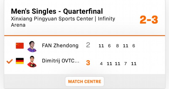荔枝新闻讯 据WTT世界乒联消息,在28日下午结束的新乡WTT世界杯决赛八强战中,德国选手奥恰洛夫3-2击败樊振东,晋级四强,他将在下一轮对阵日本选手张本智和。
