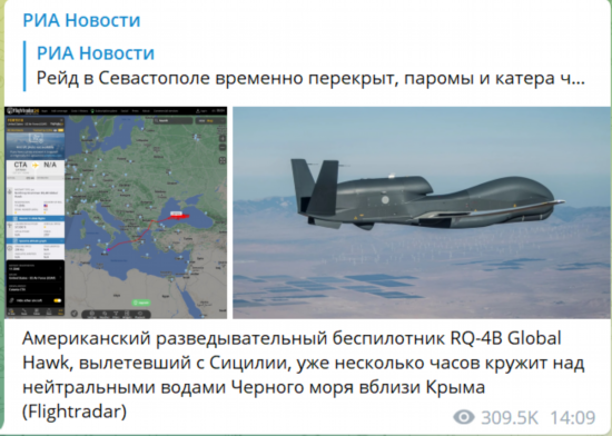 另据《俄罗斯报》报道,涉事乌军无人机在塞瓦斯托波尔湾发动袭击时,一架美国“全球鹰”无人侦察机在附近中立水域上空飞行。报道还称,飞机飞行状况实时监控网站“Flightradar24”的相关信息显示,这架美国无人机的呼号为FORTE10,是从北约位于意大利西西里岛的空军基地起飞的。