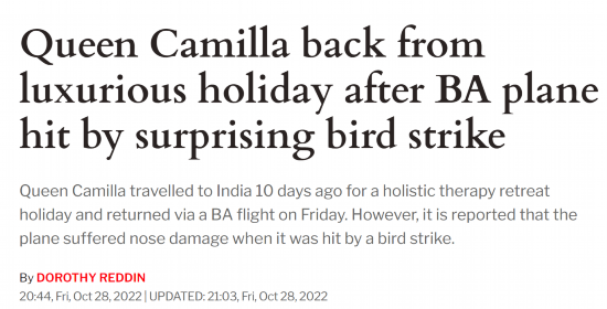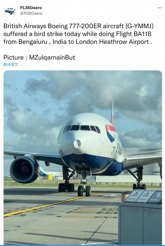 【环球网报道 见习记者 李诗睿】据英国《快报》消息,英国王后卡米拉当地时间28日乘坐英国航空公司的波音 777-200ER飞机 (G-YMMJ) 从印度班加罗尔返回伦敦希思罗机场,飞机在着陆时遭鸟撞击,机头受损。