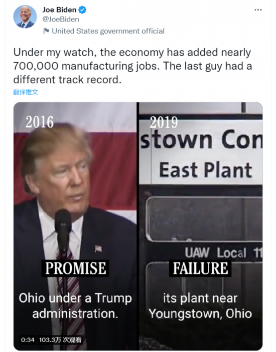 美国总统拜登当地时间28日在其推特上发了一段视频,并配文:“在我的领导下,(美国)经济已增加近70万个制造业就业岗位。上一个家伙则有不一样的业绩。”拜登推文所配的视频中,左右两幅画面来回切换,对比美国前总统特朗普曾经的“承诺”和现实的“失败”。