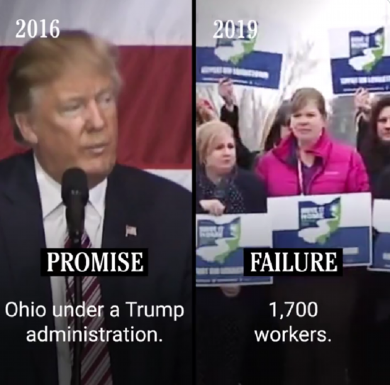 第一幕对比图中,视频中的左幅画面先是播放特朗普曾在2016年竞选期间许下誓言,言辞中提及“特朗普政府”将为俄亥俄州企业带来的帮助;随后,右幅画面开始播放2019年通用汽车公司正关闭其位于俄亥俄州扬斯敦市附近的工厂并裁员近 1700 人的新闻。↓