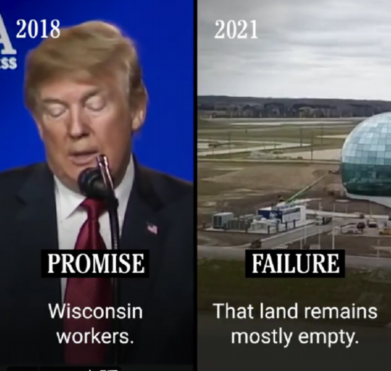 第二幕对比图中,左幅画面先是播放特朗普2018年在谈及为富士康公司工厂破土动工时称,新工厂将为威斯康星州13000 多名工人提供就业机会;随后,右幅画面开始播放2021年的新闻称,富士康在威斯康星州拉辛县工厂的 100 亿美元投资从未落实,之前动工的土地大部分仍是空的。↓
