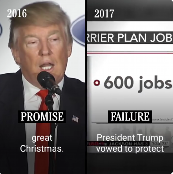 第三幕对比图中,左幅画面播放特朗普2016年的言论称,美国空调制造商开利公司的工人们会保住他们的工作,他们有一个不错的圣诞节;随后,右幅画面开始播放2017年的新闻称开利公司将裁减约 600 名印第安纳州工人,“总统特朗普”曾发誓要保住这些岗位。↓
