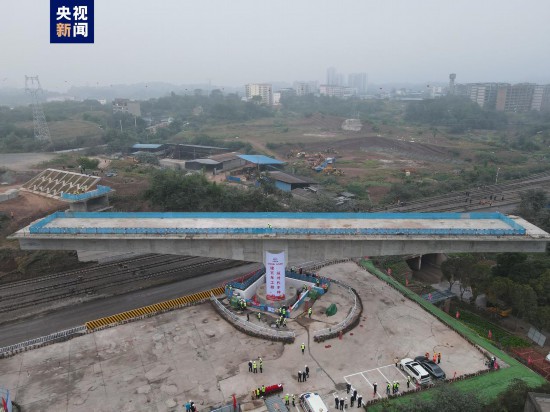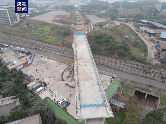记者从京昆高速铁路西昆有限公司获悉,10月30日上午9时38分,在四川泸州的重庆至昆明高速铁路(简称:渝昆高铁)寒坡岭特大桥建设现场,一条巨型T梁经过近2小时空中转体对接,成功跨越既有隆黄铁路,标志着渝昆高铁全线首座转体连续梁成功转体。