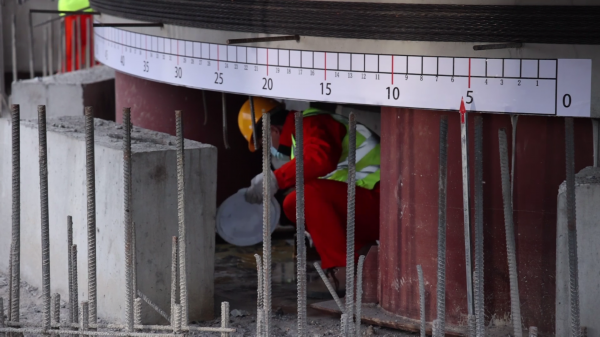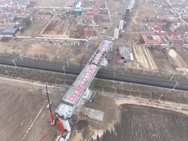 察右前旗特大桥是集大原高铁控制性工程之一,全长20.84公里,总孔数760孔。此次施工转体梁桥面宽12.4米,总重2813吨,转体角度为79.11度。在两套自动连续张拉千斤顶同步牵引作用下,整个箱梁经过60分钟平稳转动,成功转体。