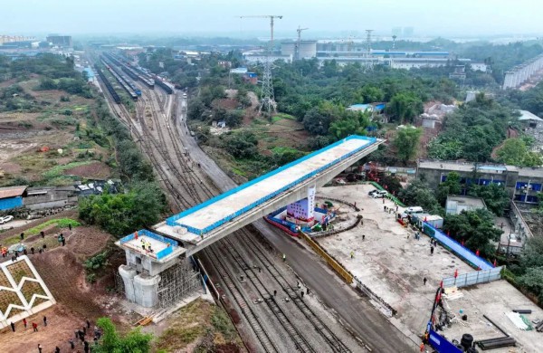 渝昆高铁寒坡岭特大桥位于四川省泸州市龙马潭区,全长3266.8米,共有97个墩台。此次施工是以78号桥墩为轴,带动94米长预应力混凝土双线连续梁整体转体,跨越既有隆黄铁路,历时2小时、平转57.5度后,实现与主桥精准对接,施工干扰性小、安全性高。