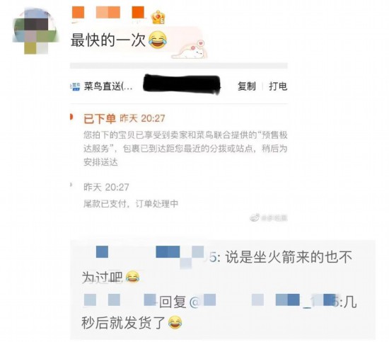 网友们对这种“擦出火星”般的发货速度也表示疑惑:平时最快也要24小时发货,三天才能送到,这次咋这么快?