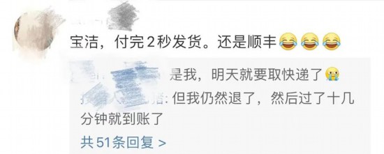 有网友留言说,“买的沐浴露,上一秒付完尾款刚想退货,紧接着就退不了了,显示已经在我家附近的快递点了,我直呼好家伙!”“何止秒发货,我晚上8点付尾款,10点已经收到货了,商家这是怕我退款啊!”“晚上付尾款,第二天早上就收到了,我还想改个收货地址……”