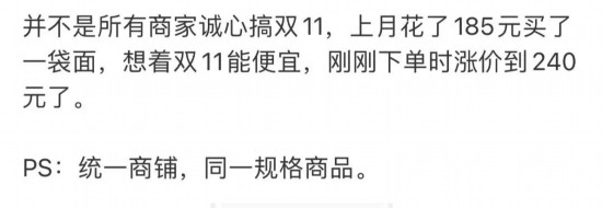 还有网友称依然碰到了“先涨价再降价”“付尾款时涨价”等套路,“平时经常吃的面粉是185一袋,双11参加满减活动涨到了240元一袋。”