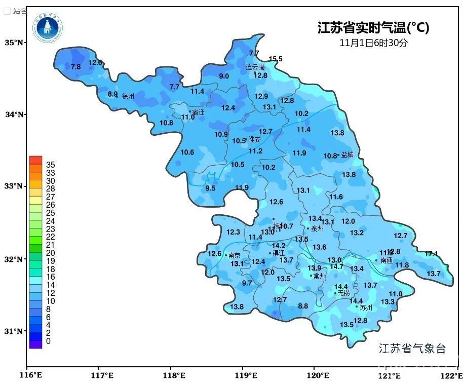 受最近的一股冷空气影响,江苏今天最低气温有所下降。据江苏省气象台消息:今日(11月1日)早晨6时30分淮北地区最低气温仅为个位数,南部气温稍高一些,在12-13℃左右。