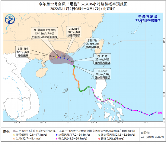 今年第22号台风“尼格”已于昨天(11月1日)晚上减弱为强热带风暴级,今天(2日)早晨5点钟其中心位于广东省台山市东偏南方向大约375公里的南海东北部海面上,就是北纬20.5度、东经115.9度,中心附近最大风力有11级(30米/秒),中心最低气压为982百帕,七级风圈半径220-320公里,十级风圈半径60公里。