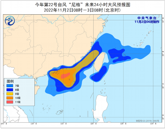 大风预报:11月2日08时至3日08时,受“尼格”和冷空气的共同影响,东海南部、台湾海峡、台湾以东洋面、巴士海峡北部、南海北部及东沙群岛附近海域、浙江南部沿海、福建沿海、台湾岛沿海、广东中部和东部沿海将有7-8级大风,其中台湾海峡、南海北部的部分海域、东沙群岛附近海域、珠江口附近及其沿海、香港沿海、广东东部沿海将有9-10级大风,阵风11-12级,“尼格”中心经过的附近海域风力有11级,阵风可达12-13级。