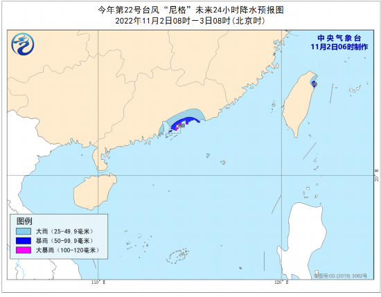 降水预报:11月2日08时至3日08时,广东珠江口附近及其东侧沿海、台湾岛东北部的部分地区将有大到暴雨,其中珠江口东侧沿海有大暴雨(100-120毫米)。