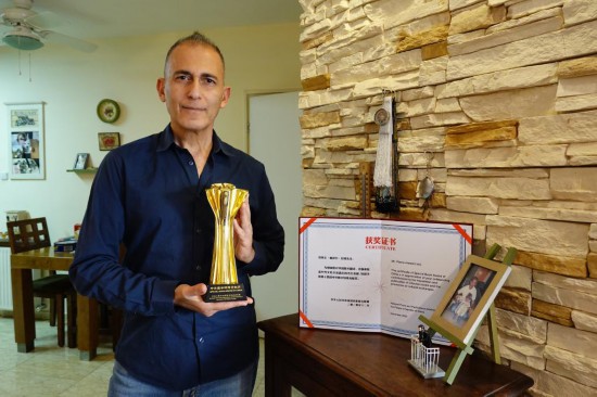 4月11日,以色列出版家皮埃尔·赫泽尔·拉维在位于耶路撒冷的家中与第十四届中华图书特殊贡献奖的奖杯和证书合影。新华社记者王卓伦摄