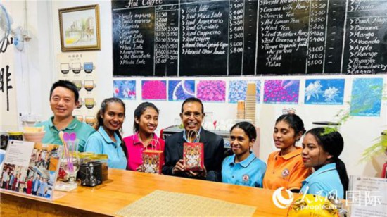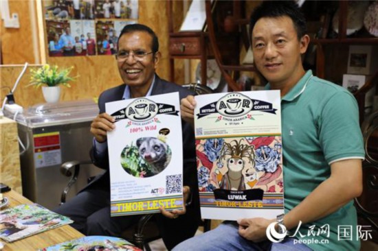 10月11日,东帝汶总理鲁瓦克与帝力全盛AR咖啡店老板陈丽松推介东帝汶猫屎咖啡。人民网记者 孙广勇 摄