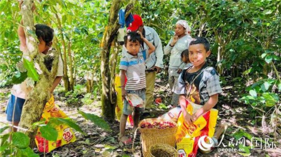 在中国驻东使馆援助下,基里莱洛村咖啡产量大幅提高,图为村民正在采收咖啡。人民网记者 孙广勇 摄