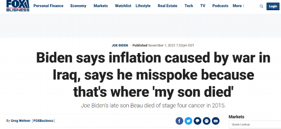 “通货膨胀现在是一个世界性的问题,因为伊拉克战争和(其他因素)对石油的影响,以及俄罗斯所做的...... 不好意思,是乌克兰战争,”拜登随即改口,并解释称:“我想到伊拉克,因为那是我儿子去世的地方。”