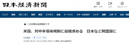 报道称,针对有关对华限制措施,美方敦促日本等盟国与美国保持步调一致,出台类似的措施,限制高端半导体等产品的对华出口。针对中国,美国计划与盟国“合作”,加强限制性措施的效果,从而让中国难以获得或生产高端半导体。就这种管制措施,日本经济产业大臣在11月1日的记者会上宣称:“正在与美国进行沟通,并听取日本国内企业的意见。”