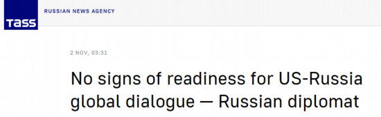 综合俄罗斯卫星通讯社、塔斯社11月2日报道,美国白宫国家安全委员会发言人约翰 柯比表示,美国并不寻求与俄罗斯冲突,华盛顿希望通过谈判解决乌克兰问题。据塔斯社报道,俄罗斯常驻联合国副代表波利扬斯基于当地时间11月1日称,没有迹象表明,美国和俄罗斯准备讨论国际事务。不过,他强调,俄罗斯“不对任何人关闭大门”。