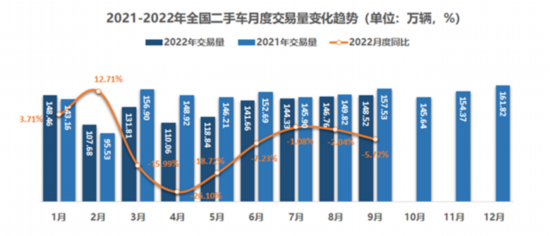 人民网北京11月3日电 据中国汽车流通协会(以下简称流通协会)消息,11月2日,中国汽车流通协会发布2022年9月全国二手车市场深度分析报告。数据显示,今年9月,全国二手车市场交易量为148.52万辆,交易量环比增长1.2%,同比下降5.72%,交易金额为966.95亿元;1至9月,全国二手车累计交易1198.12万辆,同比下降7.6%。