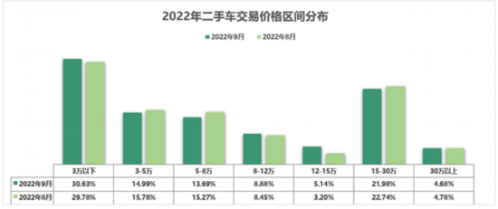 新能源汽车方面,今年9月,8-15万元的新能二手车增长明显,占比为14%较上月增加了2.4%,其中12-15万元区间的新能源二手车占5.14%,较上月增加了1.94%。15万元以上的车型占26.67%,较上月下降了0.85个百分点,其中15-30万元区间占21.98%,较上月下降了0.75%。
