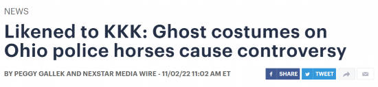 【环球网报道 记者 张晓雅】据美国《国会山报》11月2日报道,美国俄亥俄州莱克县骑警马匹的万圣节装扮引起争议,有人批评称,警方把其马匹打扮成的“幽灵”模样,很像美国历史上出现并带有严重种族歧视色彩和行为的组织“三K党”。俄亥俄州莱克县警长为此表示并非有意冒犯任何人,但仍引起一些网友不满。