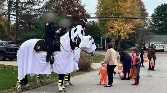 莱克县警长弗兰克·莱昂布鲁诺还为这一装扮辩解称,所以,骑警们想,“‘让这些大幽灵在街上漫步真是个好主意,’当马沿着街道走的时候,它们为万圣节增添了亮点。说实话,社区居民们很喜欢。孩子们说它们是很棒的幽灵马。”