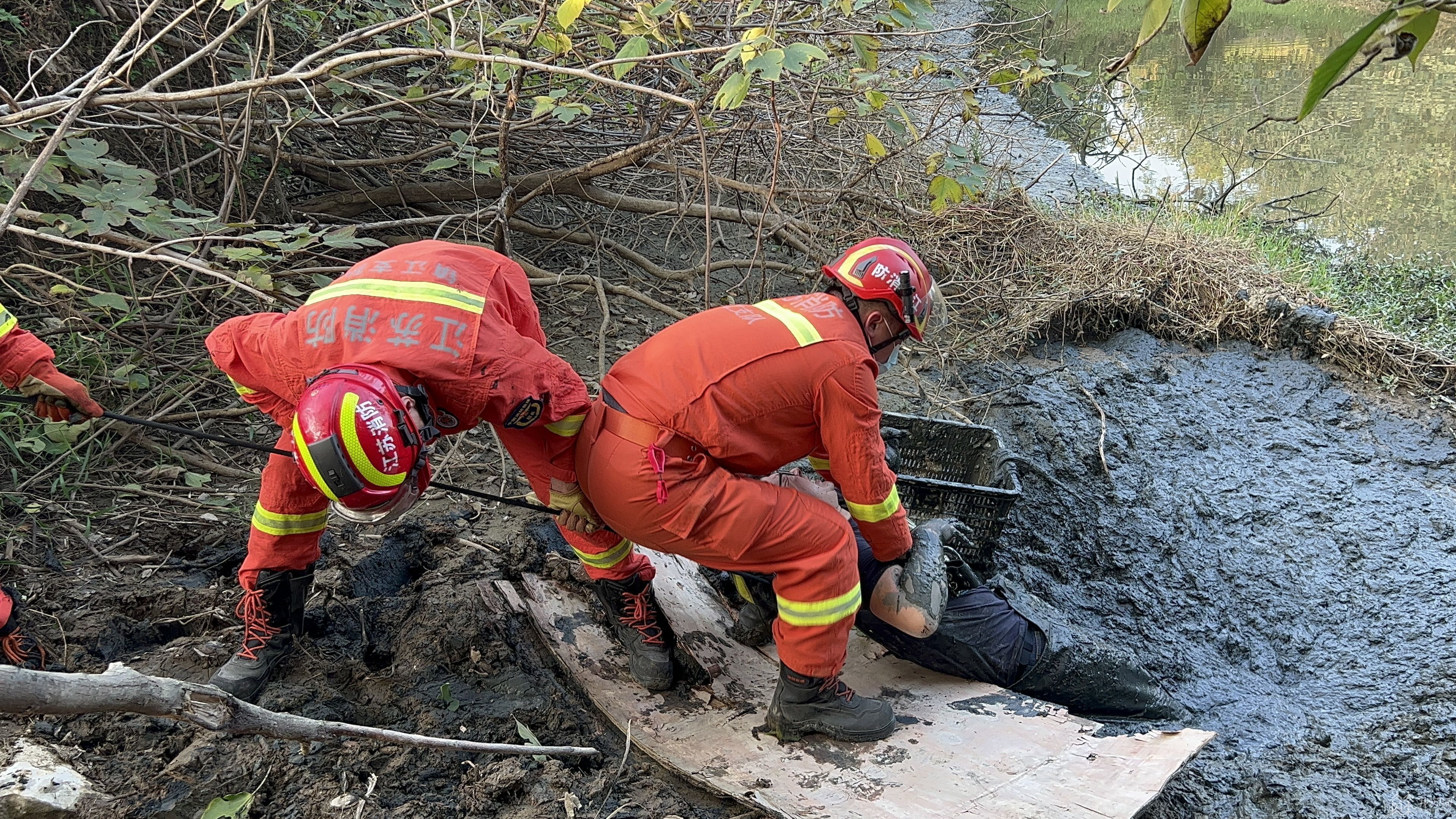 消防救援人员到达现场后,发现农场内湖边的淤泥处,一男子大半个身体深陷其中,浑身上下都被淤泥染得漆黑,随时有继续深陷的危险。