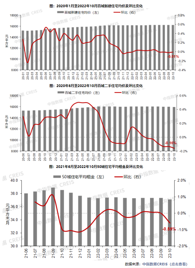 中指研究院公布的数据还显示,2022年10月,全国100个城市的新房平均价格为16199元/㎡,环比下跌0.01%,跌幅较9月收窄0.01个百分点。同比数据看,全国100个城市的新房平均价格较去年同期上涨0.06%,涨幅收窄0.09个百分点。