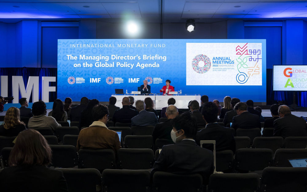 10月13日,在美国华盛顿,国际货币基金组织(IMF)总裁格奥尔基耶娃(右)出席记者会。(新华社记者刘杰摄)