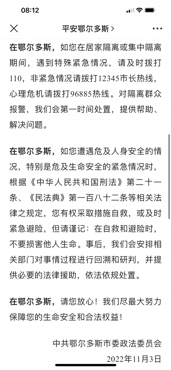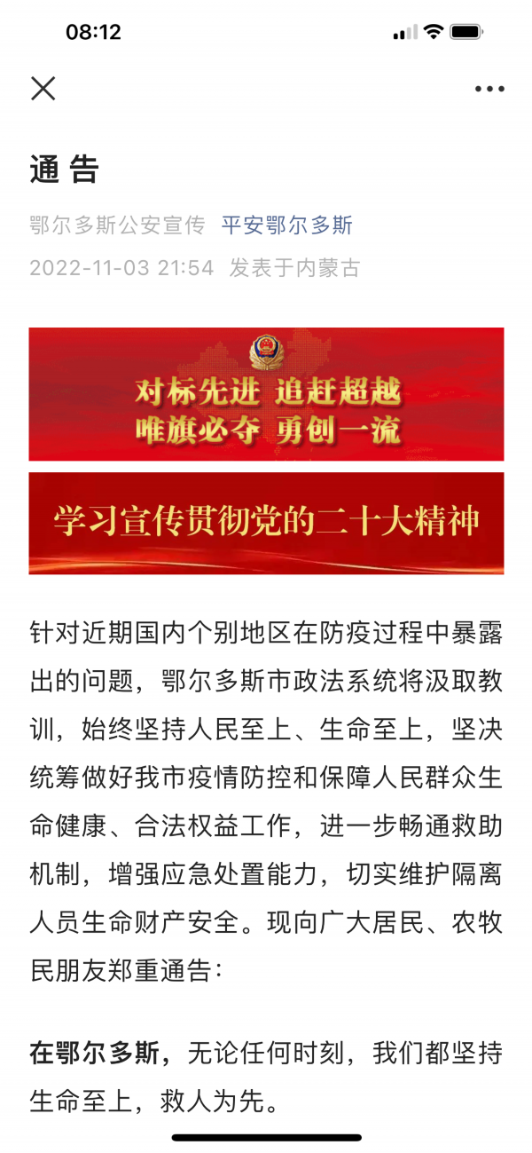 荔枝新闻讯 据“平安鄂尔多斯”微信公众号消息,中共鄂尔多斯市委政法委员会11月3日发布通告,针对近期国内个别地区在防疫过程中暴露出的问题,鄂尔多斯市政法系统将汲取教训,始终坚持人民至上、生命至上,坚决统筹做好我市疫情防控和保障人民群众生命健康、合法权益工作,进一步畅通救助机制,增强应急处置能力,切实维护隔离人员生命财产安全。现向广大居民、农牧民朋友郑重通告: