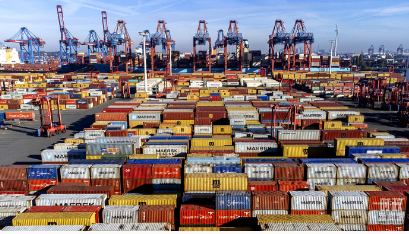 △2022年10月,来自中国等国的集装箱整齐堆放在德国汉堡港口。(图/视觉中国)