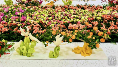 △人民大会堂内摆放的中坦两国国旗。(总台央视记者赵化拍摄)