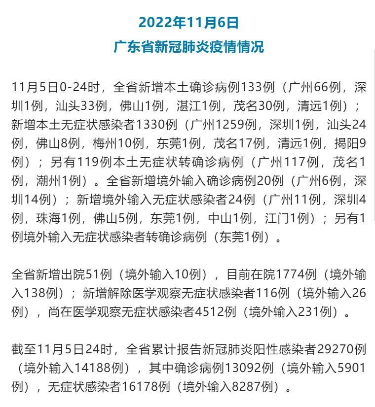 荔枝新闻讯 11月5日0—24时,广东全省新增本土确诊病例133例(广州66例,深圳1例,汕头33例,佛山1例,湛江1例,茂名30例,清远1例);新增本土无症状感染者1330例(广州1259例,深圳1例,汕头24例,佛山8例,梅州10例,东莞1例,茂名17例,清远1例,揭阳9例);另有119例本土无症状转确诊病例(广州117例,茂名1例,潮州1例)。全省新增境外输入确诊病例20例(广州6例,深圳14例);新增境外输入无症状感染者24例(广州11例,深圳4例,珠海1例,佛山5例,东莞1例,中山1例,江门1例);另有1例境外输入无症状感染者转确诊病例(东莞1例)。