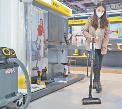 11月6日,在进博会消费品展区,展台工作人员正在演示无线吸尘器。
