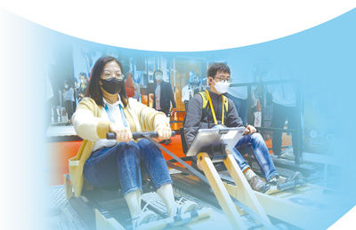 11月6日,在进博会消费品展区,观众正在体验多功能划船机。