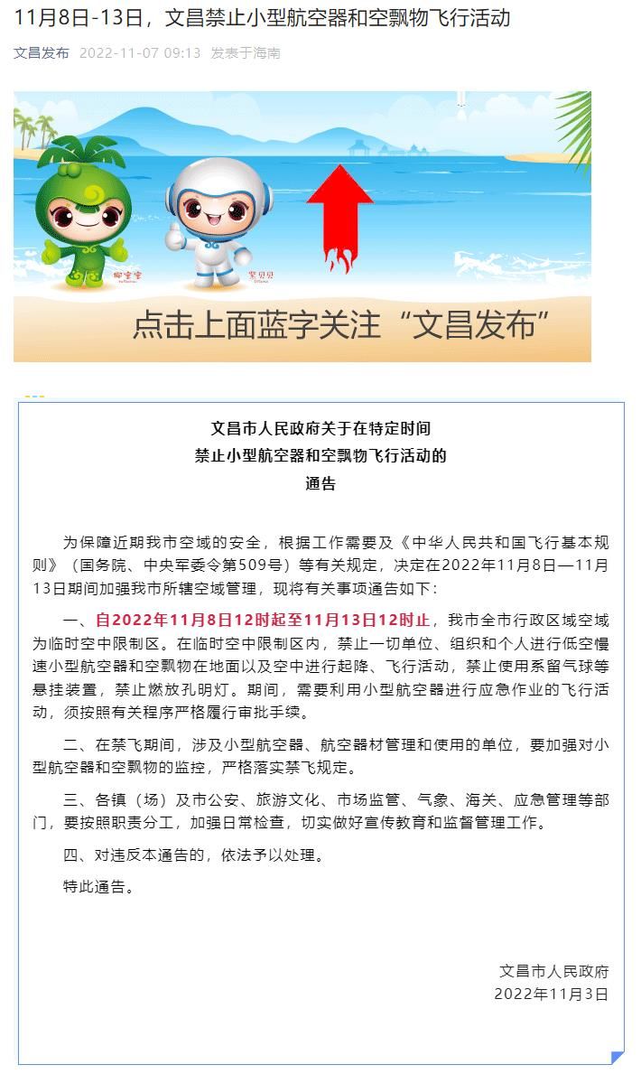 一、自2022年11月8日12时起至11月13日12时止,文昌市全市行政区域空域为临时空中限制区。在临时空中限制区内,禁止一切单位、组织和个人进行低空慢速小型航空器和空飘物在地面以及空中进行起降、飞行活动,禁止使用系留气球等悬挂装置,禁止燃放孔明灯。期间,需要利用小型航空器进行应急作业的飞行活动,须按照有关程序严格履行审批手续。