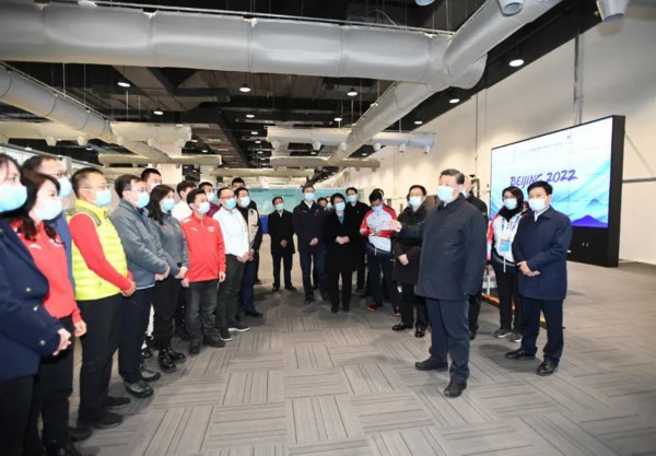 2022年1月4日,习近平在北京考察2022年冬奥会、冬残奥会筹办备赛工作。这是4日上午,习近平在北京冬奥会、冬残奥会主媒体中心媒体工作间,同正在做准备的国内媒体记者代表亲切交流。新华社记者谢环驰摄