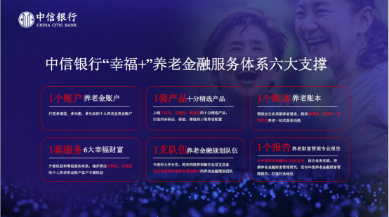 中信银行始终牢记“国之大者”的使命担当,关注养老金融的现实需求,深刻理解养老财富管理转型趋势,升级了“幸福+”养老金融服务体系。