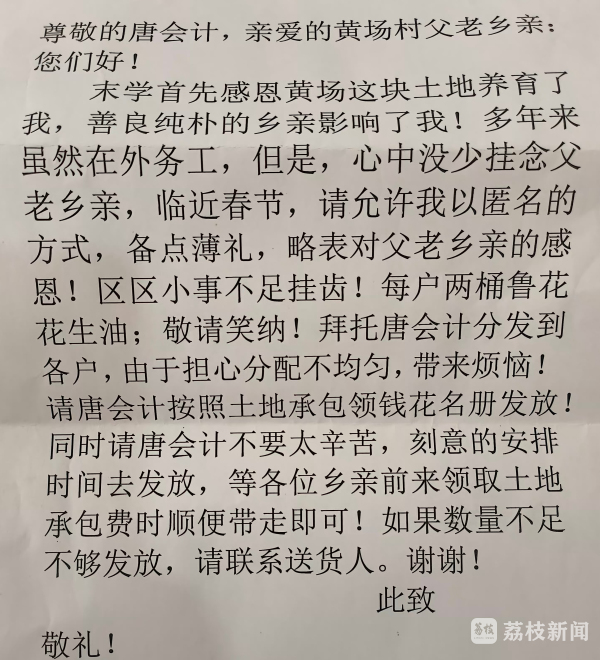 “首先感恩黄场这块土地养育了我,善良纯朴的乡亲影响了我!多年来,虽然在外务工,但是心中一直挂念着父老乡亲……”西沙村党支部书记姜涛告诉记者,这封匿名信上并没有提到任何姓名和身份等信息,在表达了自己对家乡父老的感恩之情后,详细对这些油的分配做了计划,每户两桶,不够的话可以联系厂家发货,还提前交代好了送货人帮忙补发,非常细心。经清点,这批食用油共计332桶,以批发价售出价值56100元。