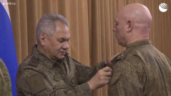 俄新社报道中的视频显示,绍伊古在指挥所听取了相关报告,与苏罗维金等一线作战人员进行了讨论,还向俄军士兵颁发了奖章。不过,俄国防部和俄媒均未透露绍伊古此次视察的具体时间和地点。
