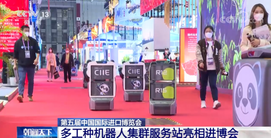 在第五届进博会上,全球首创的多工种机器人集群服务站重装亮相,在展馆内提供引领、导览、安防巡检、环保回收等服务。