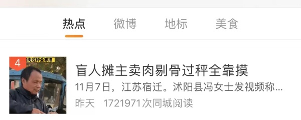 眼睛虽然看不见,但切肉、剔骨,每一刀都精准无比,从不缺斤少两……近日,宿迁市沭阳县一个盲人摊主冲上了多个社交媒体的热搜。“要做到这样的熟能生巧,背后付出的努力一定也远超常人!”这样的评论引起了许多人的共鸣,短短几天,他的乐观、励志和20年的诚信经营,累计已吸引近200万网友关注。